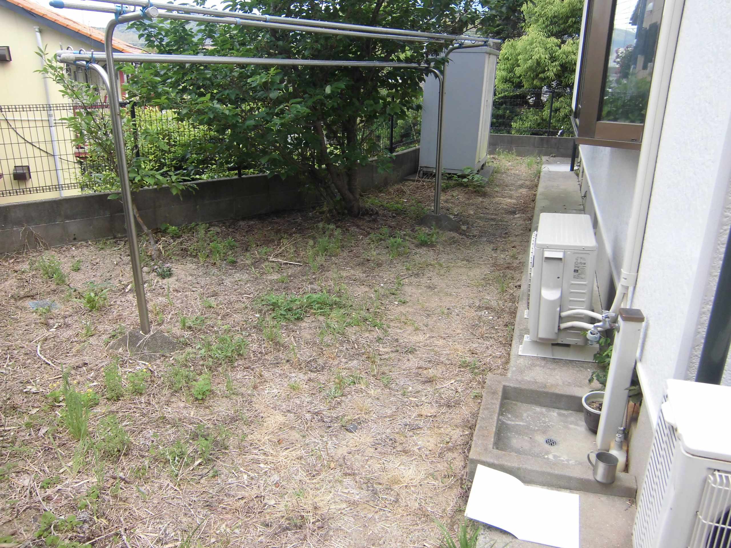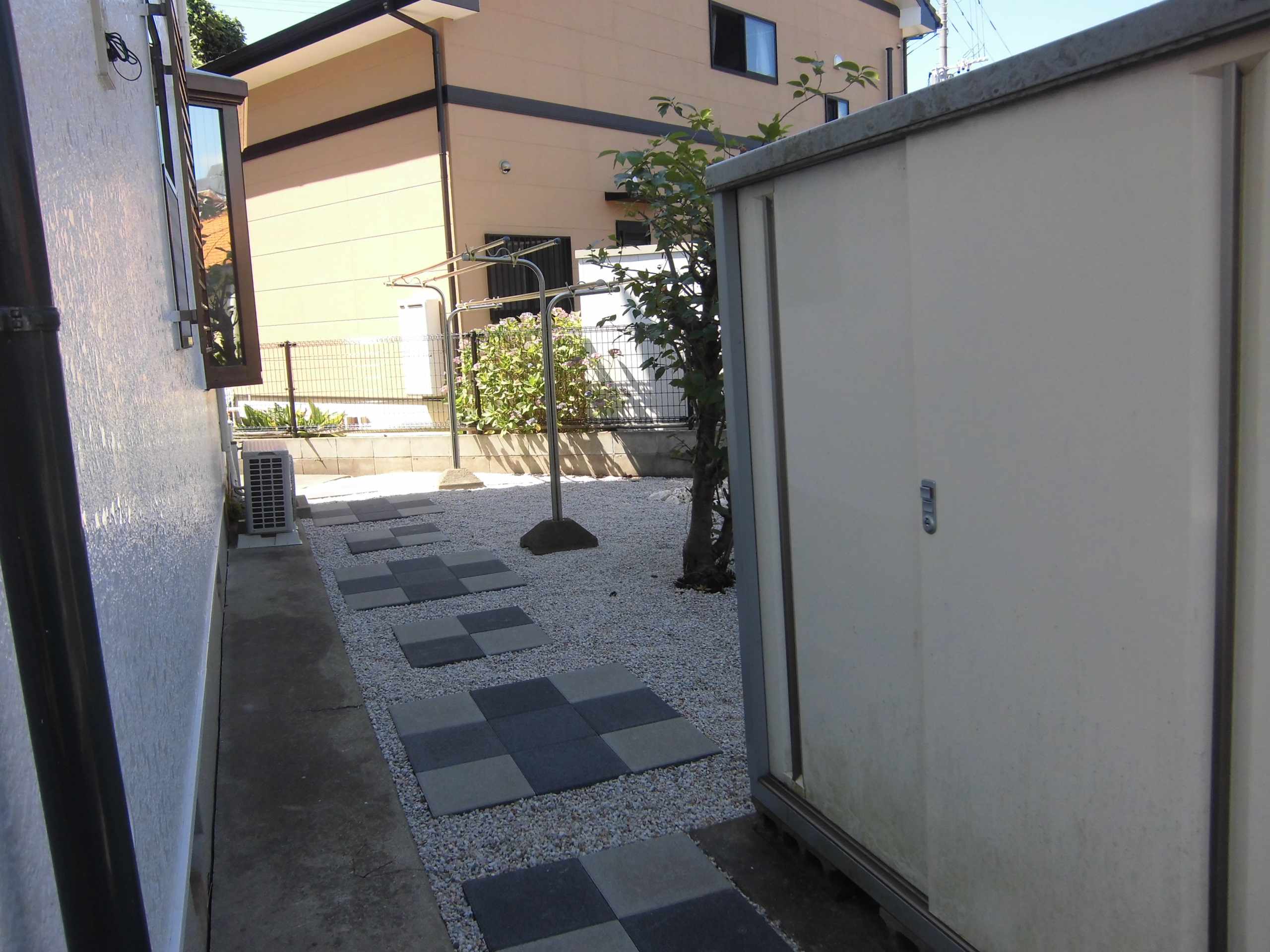 82佐世保市 雑草対策に、五島ろう石を敷き詰めました。アクセントに30㎝角のコンクリート製敷石を布設。
