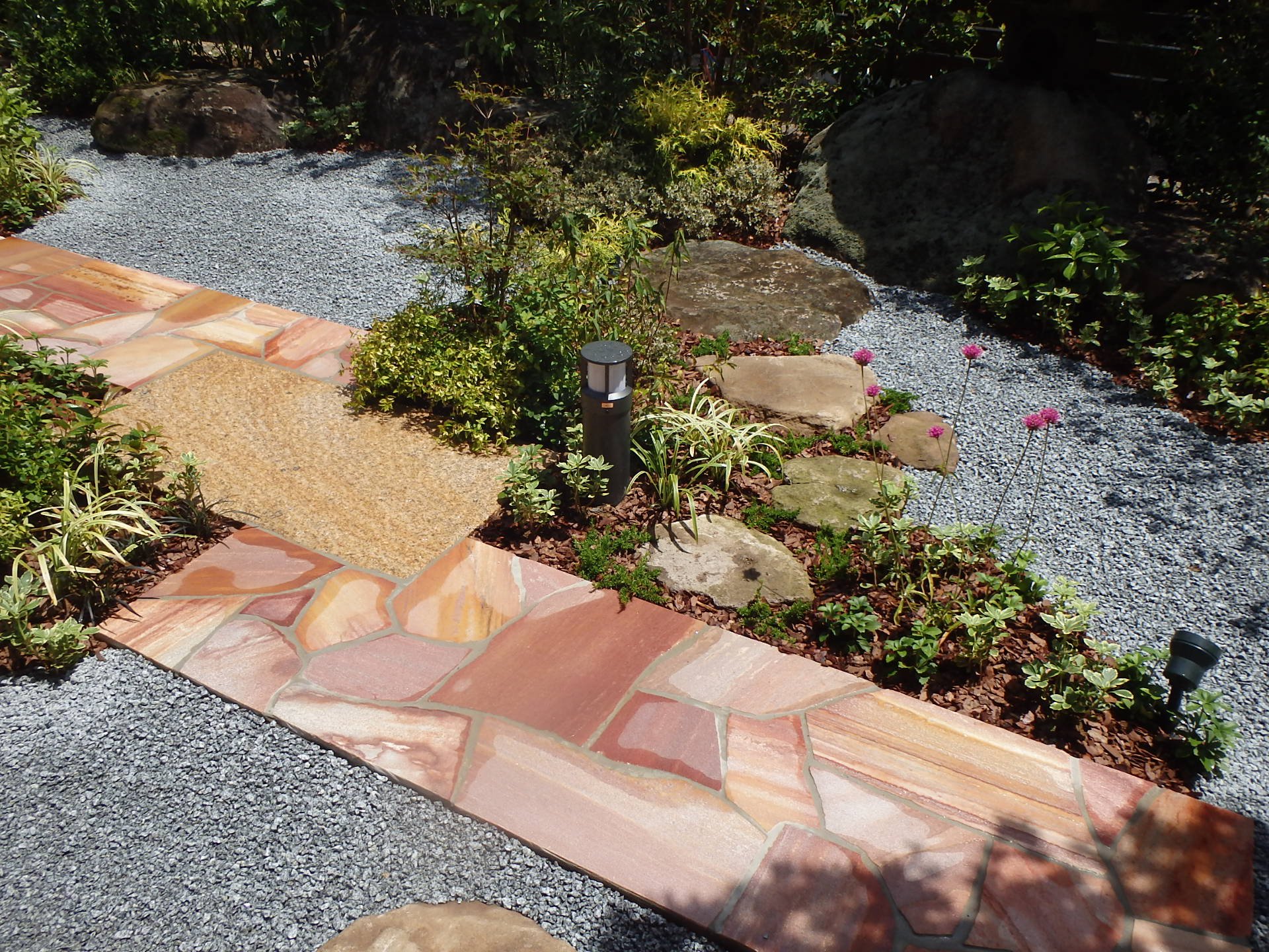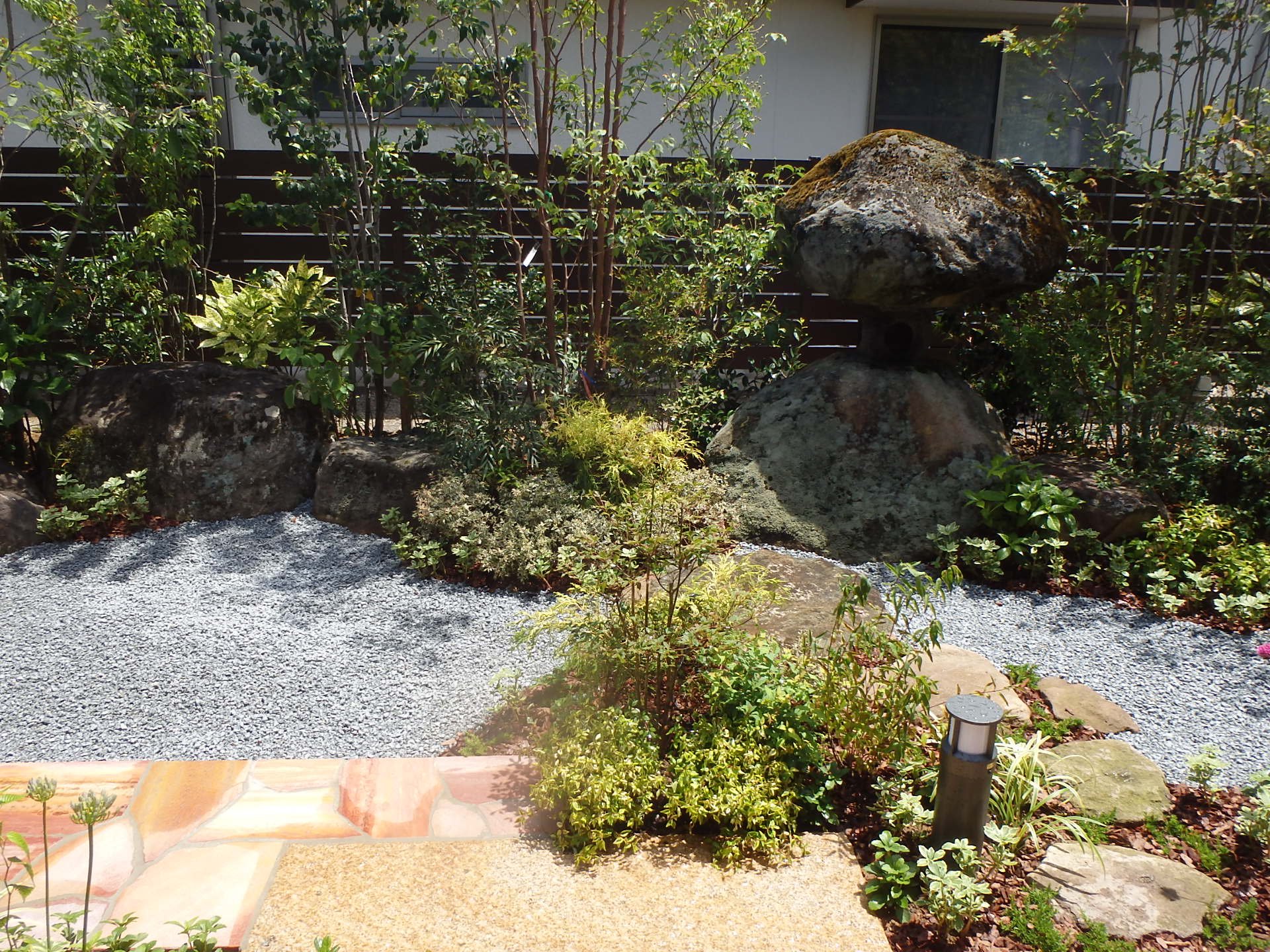 ガーデンの施工例: 110 お庭に化粧石を貼ってアクセントを付けました。風流な和のお庭で雨の日も見ていて落ち着きます。