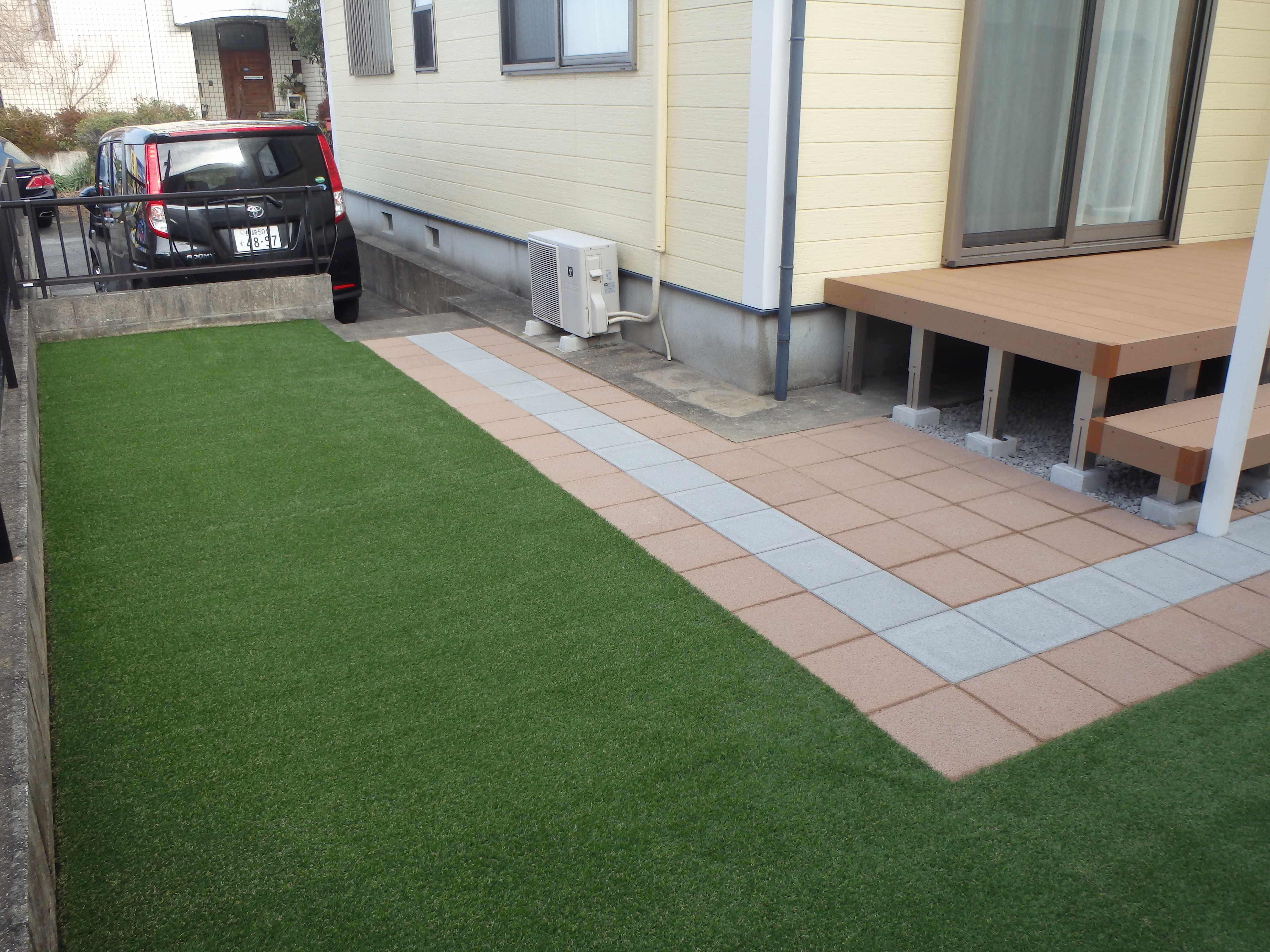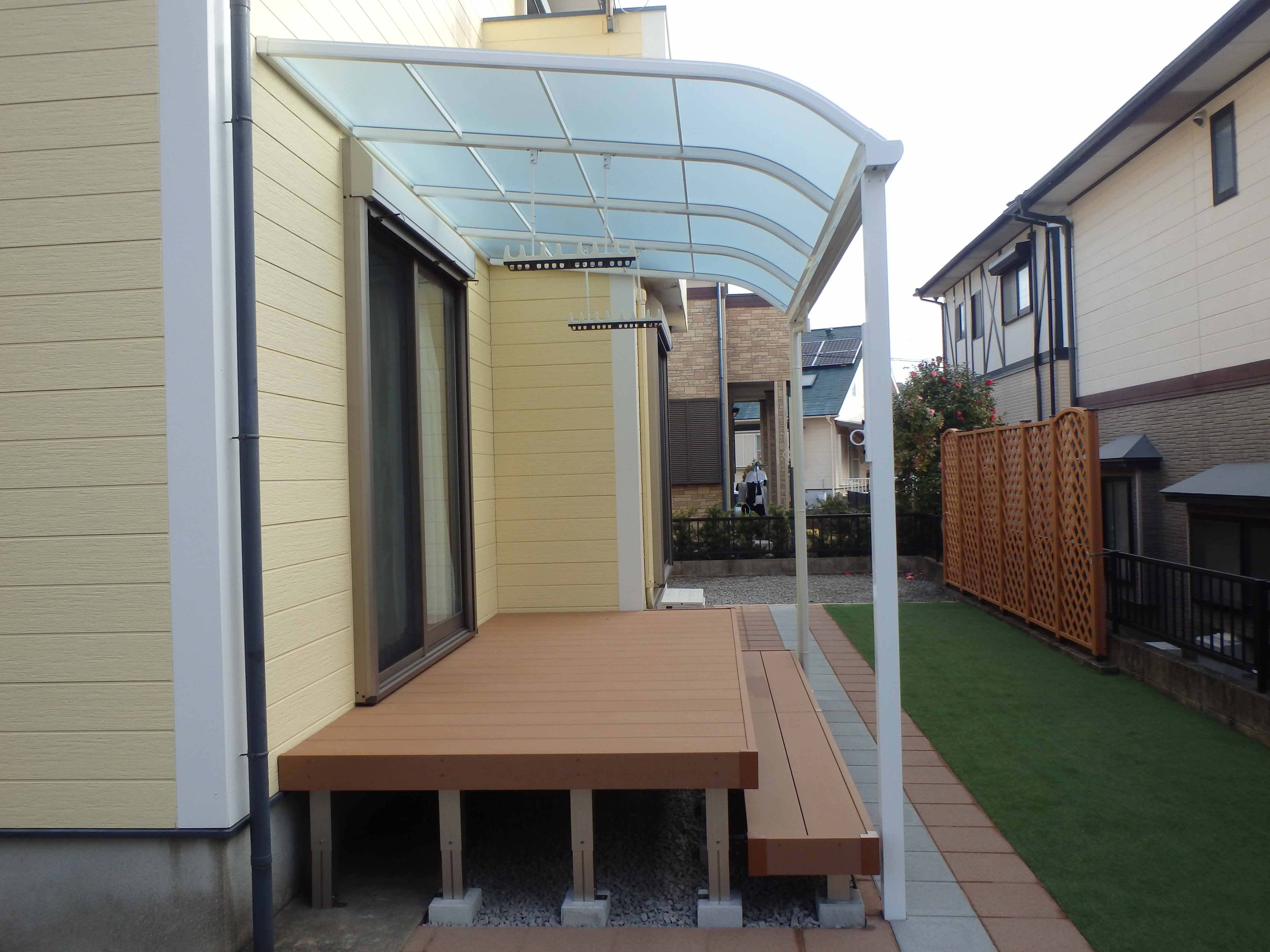 ガーデンの施工例: 130 テラスとデッキスペースを設けてゆっくりくつろげます。雨の日もいいね~