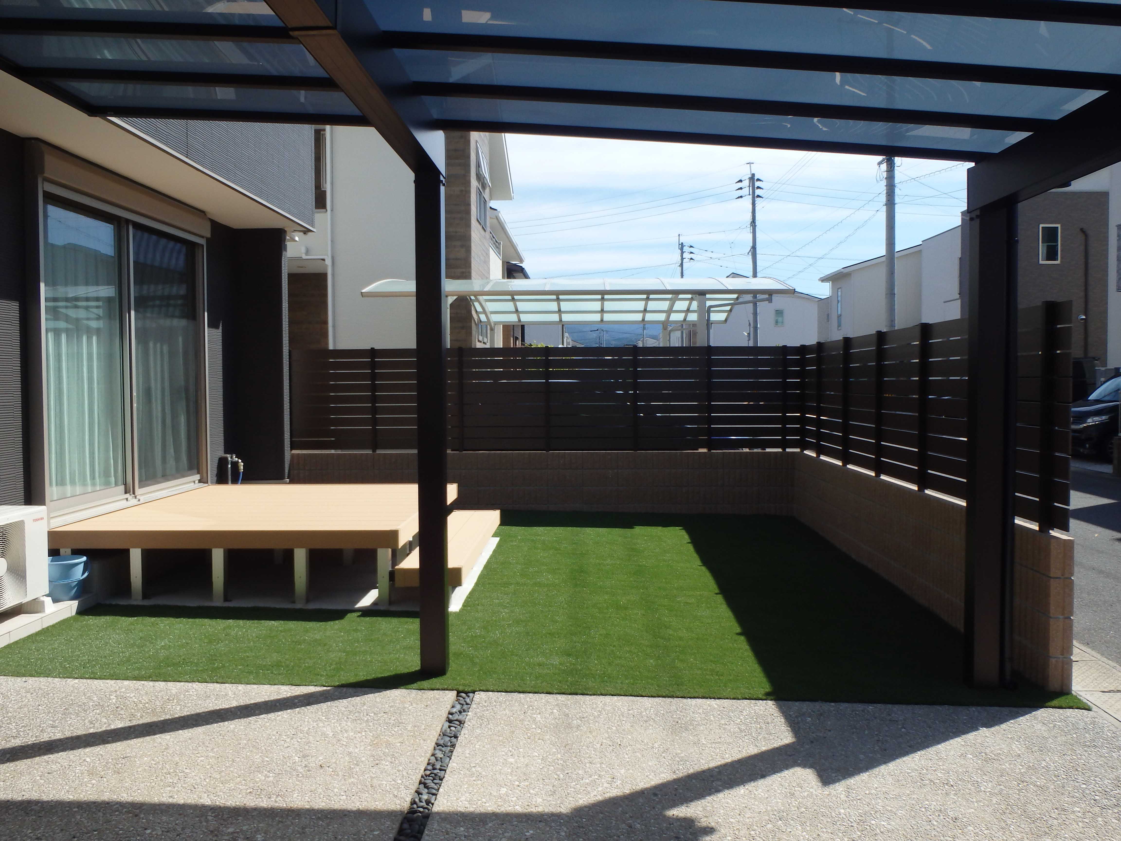 ガーデンの施工例: 148 ゆったりとしたカーポートにデッキと人工芝がとても綺麗です、お家時間が楽しくなりそう。