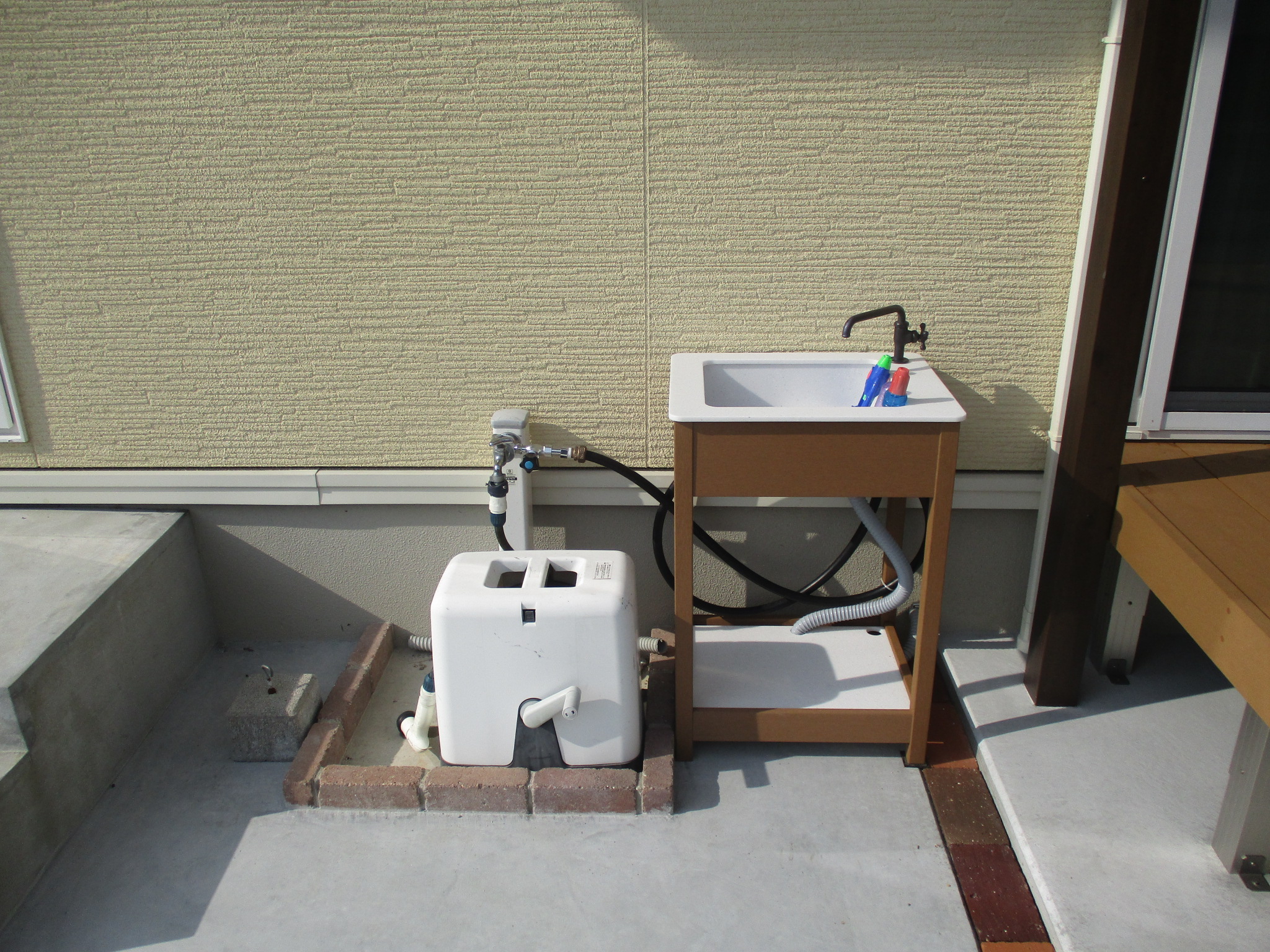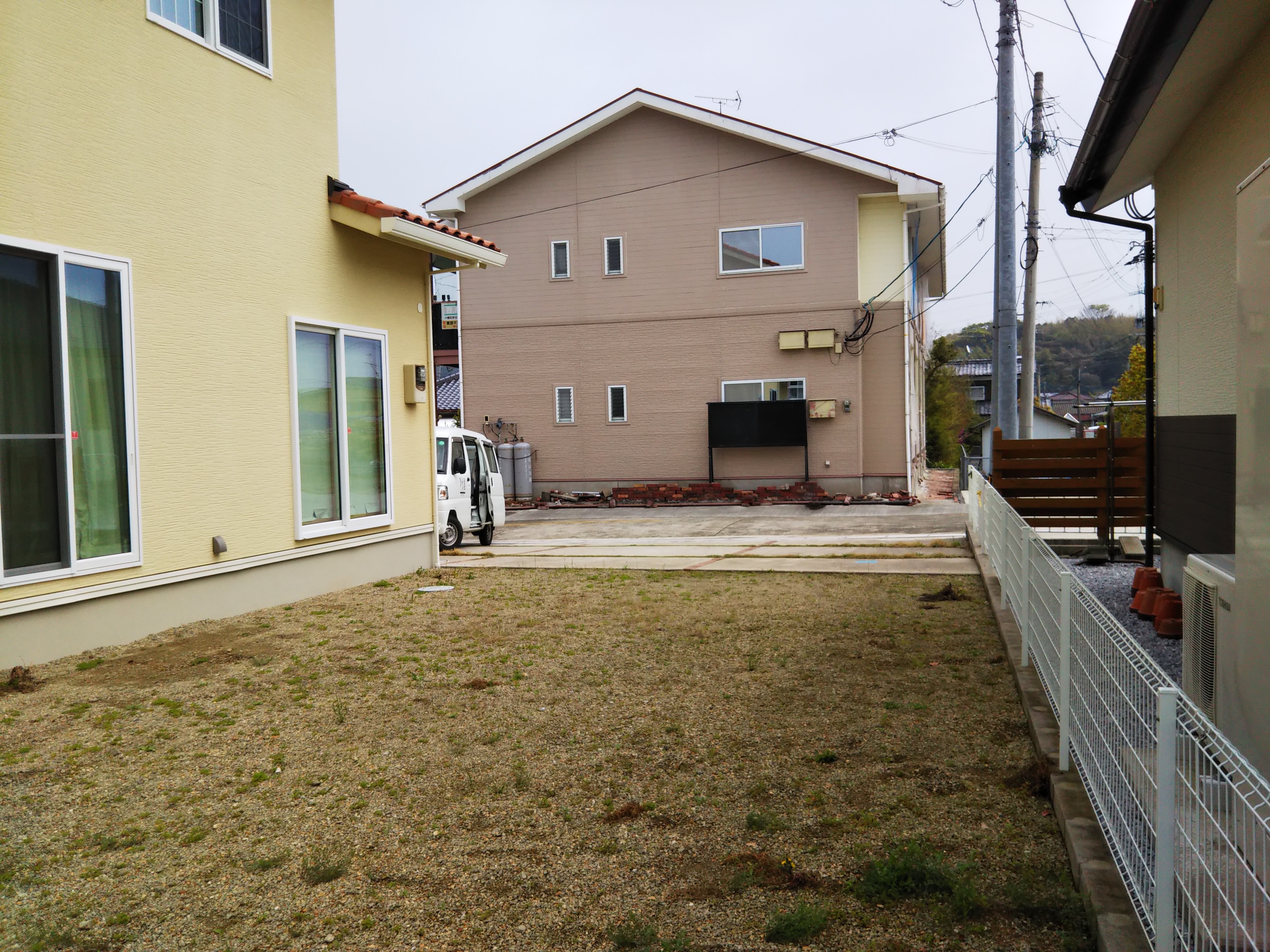 お庭の土の部分を無くして、タイル+コンクリート+砂利にしました。