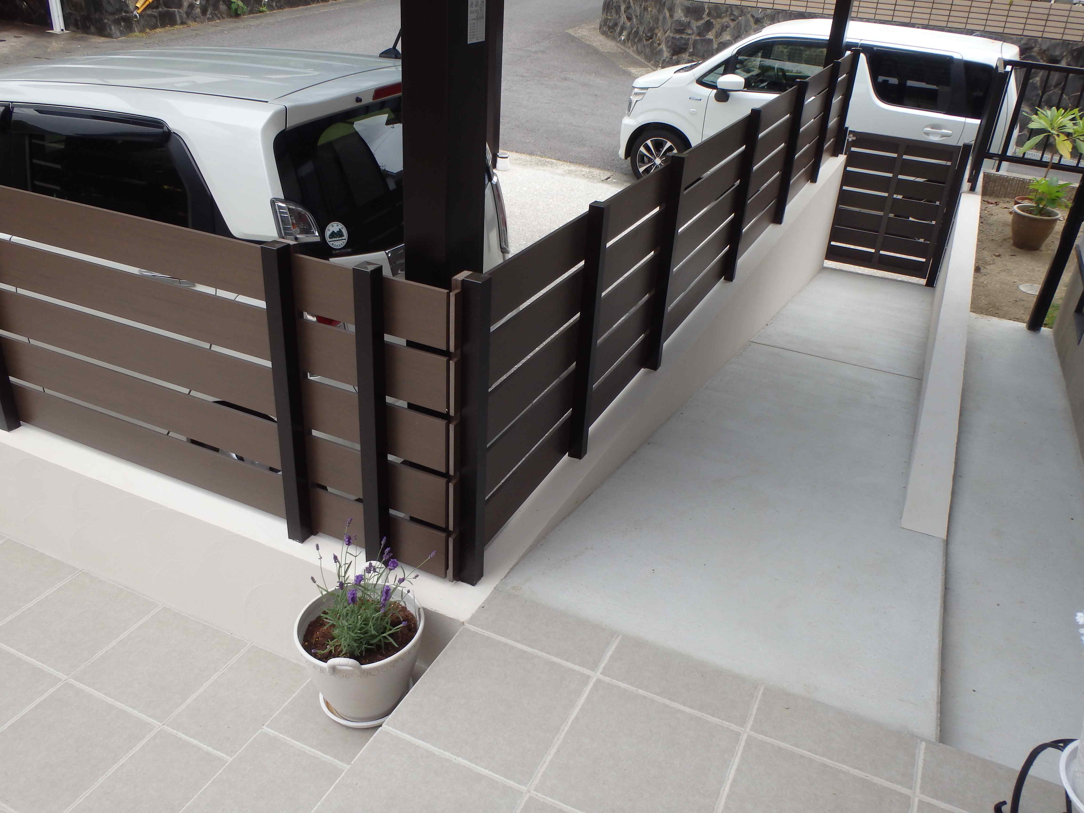 ガーデンの施工例: 188 今風のお庭に大変身、カーポートがあると愛車の寿命が延びます。全体的にとてもおしゃれです。