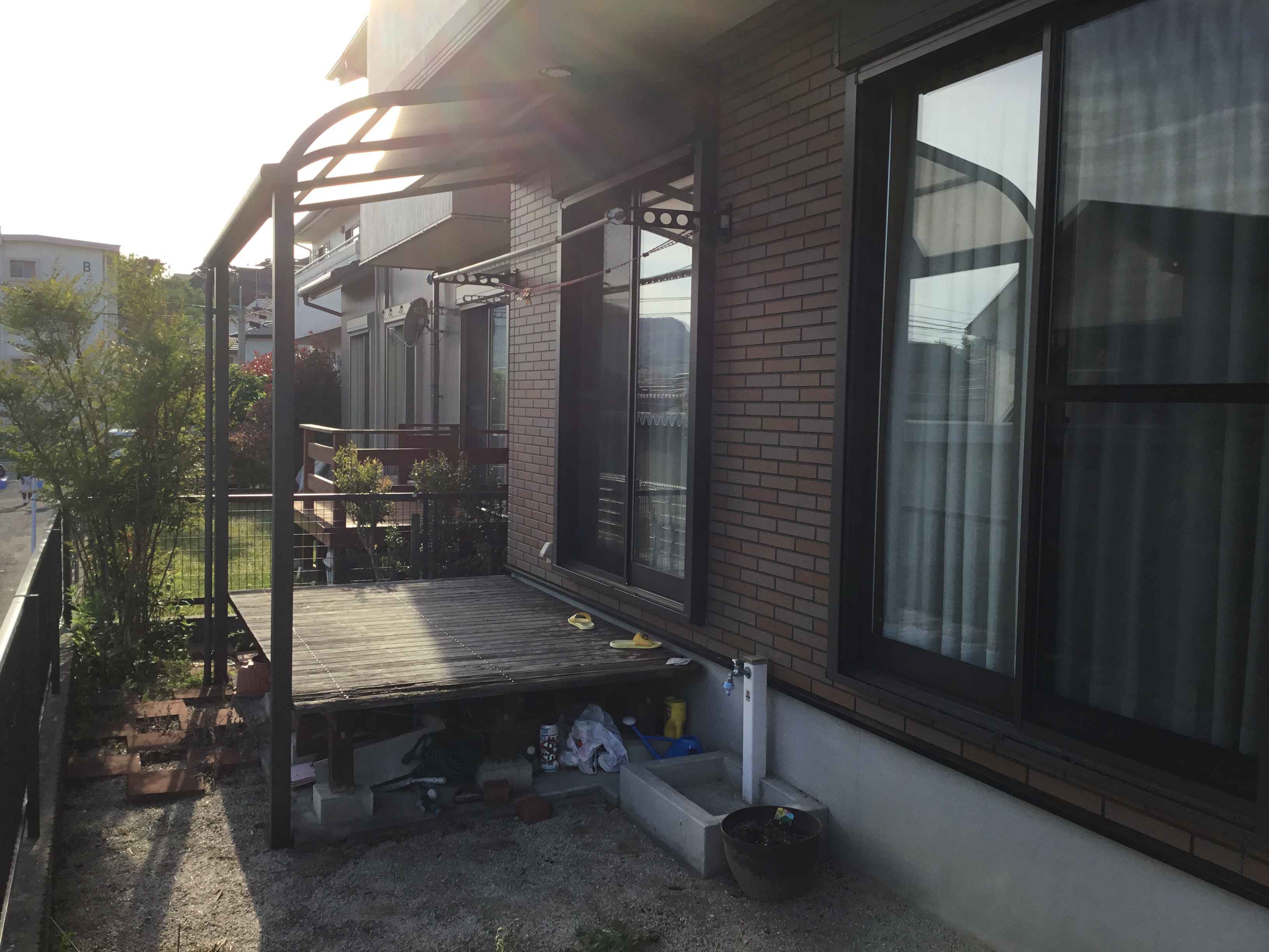 古くなったテラスと、木製デッキ、その他お庭へ続く通路の改修工事です。