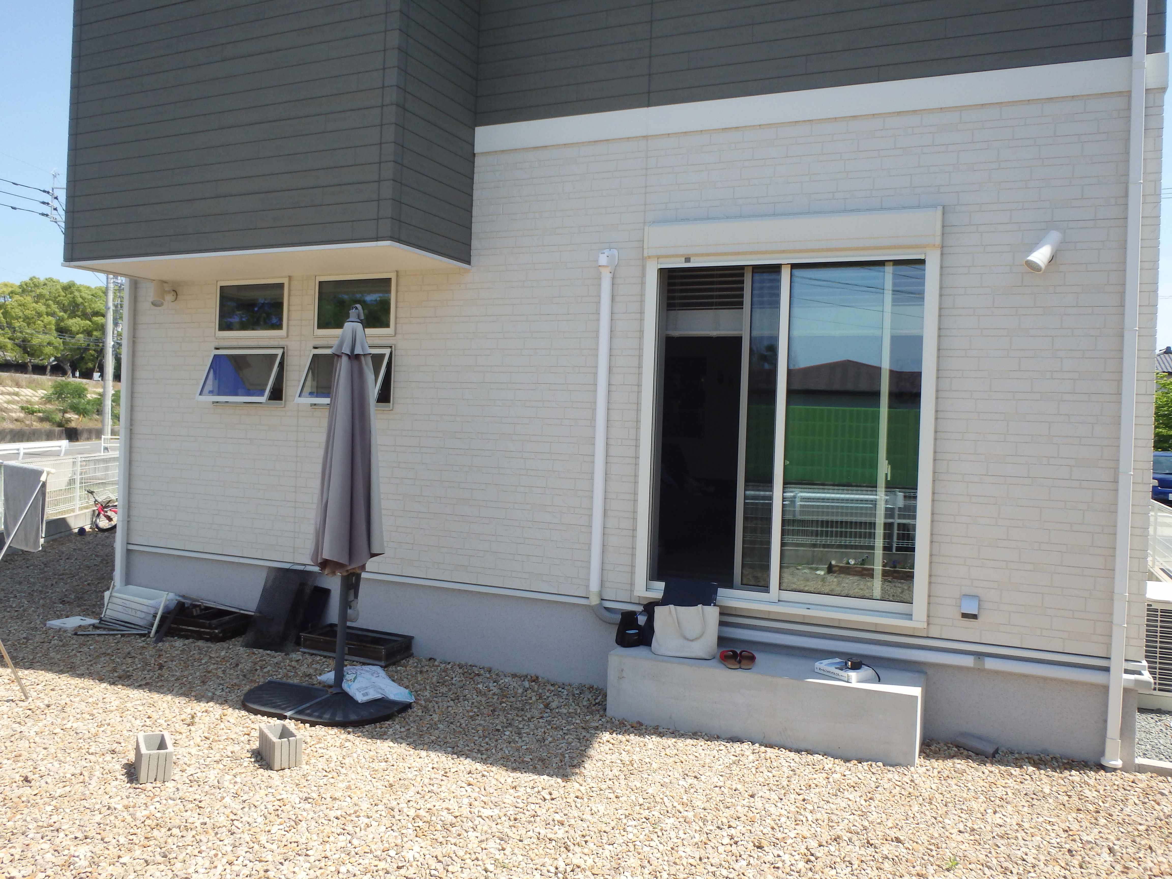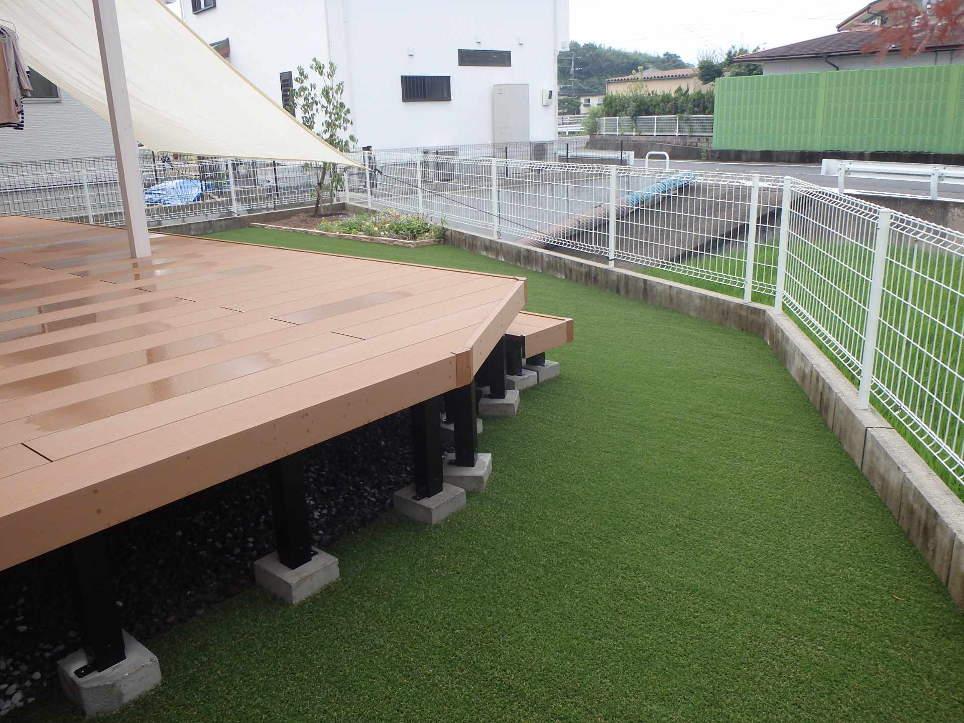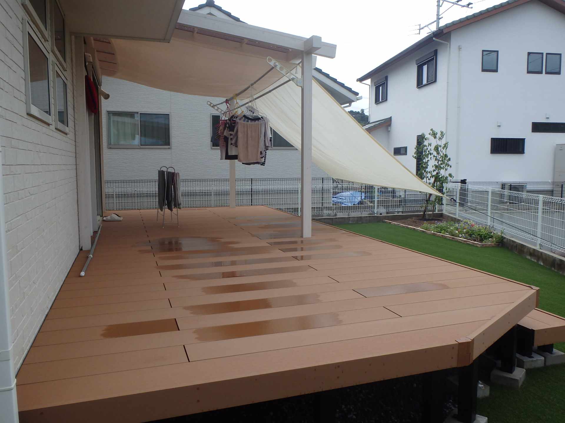テラス・デッキの施工例: 121 テラスデッキと陽よけシェードでゆっくりくつろげます。