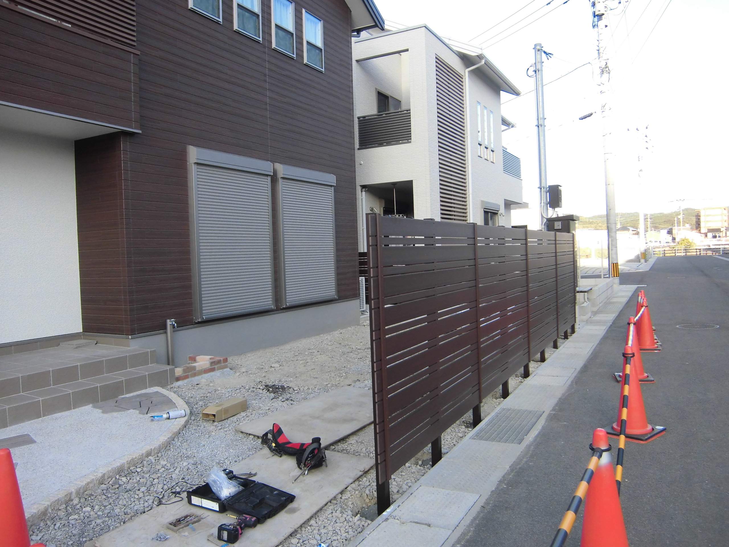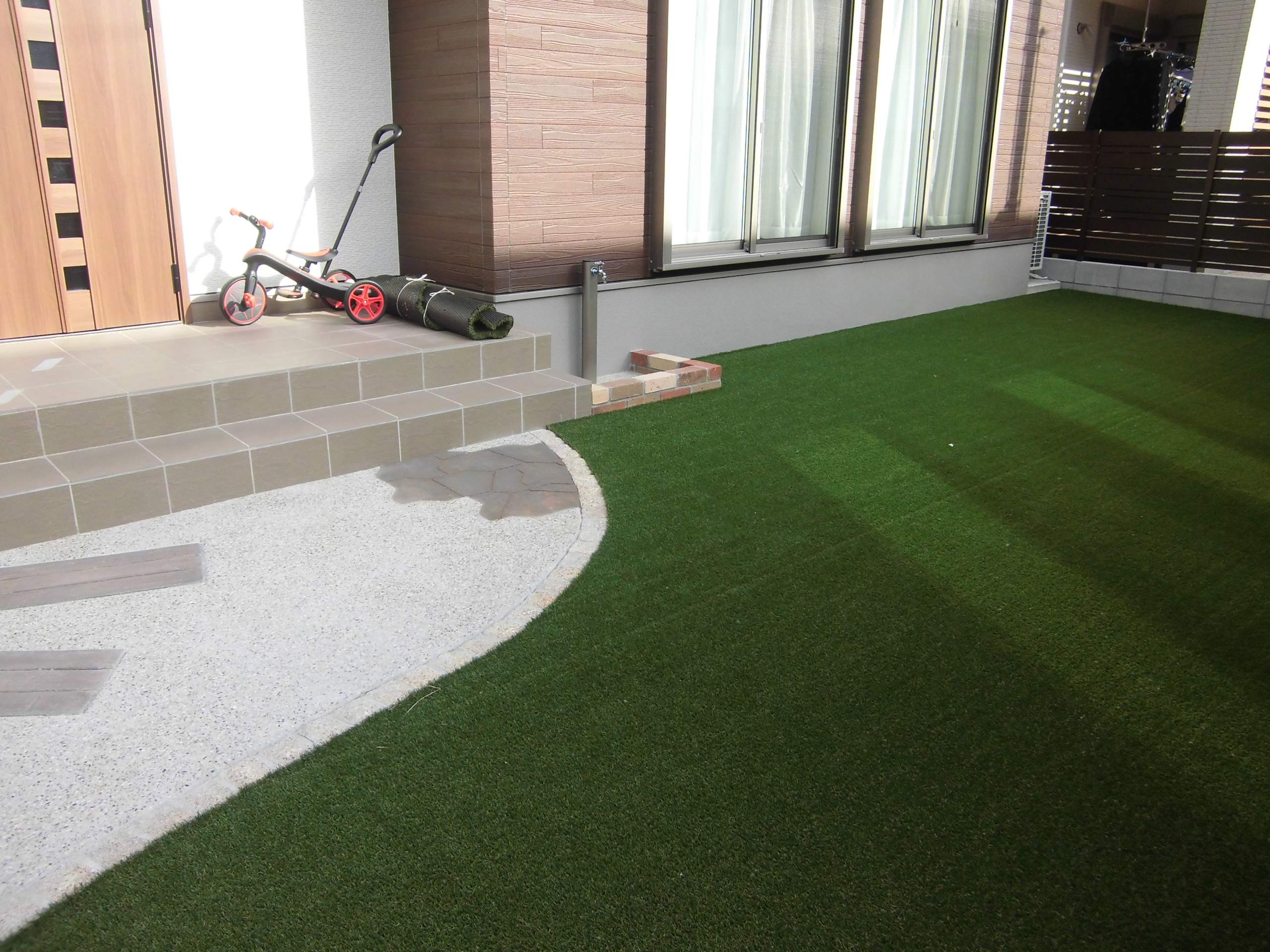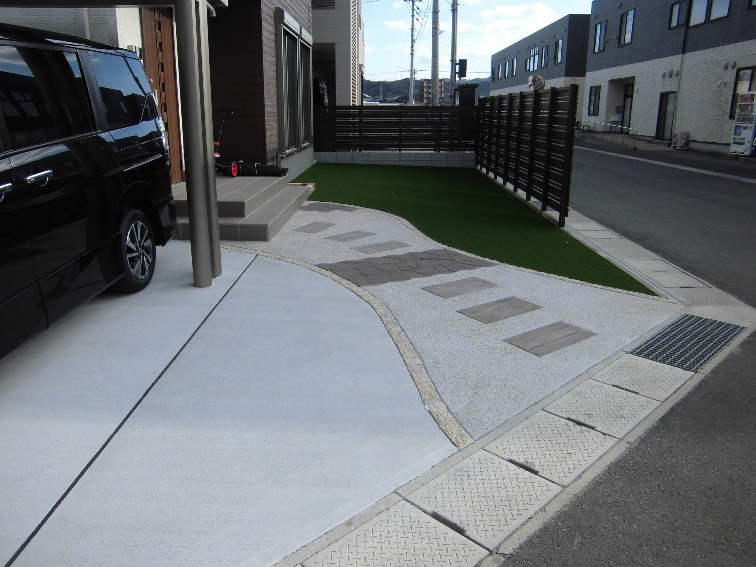 新築外構の施工例: 128佐世保 玄関まで流れるようなデザイン、建物と駐車スペースのバランスもグッドです。
