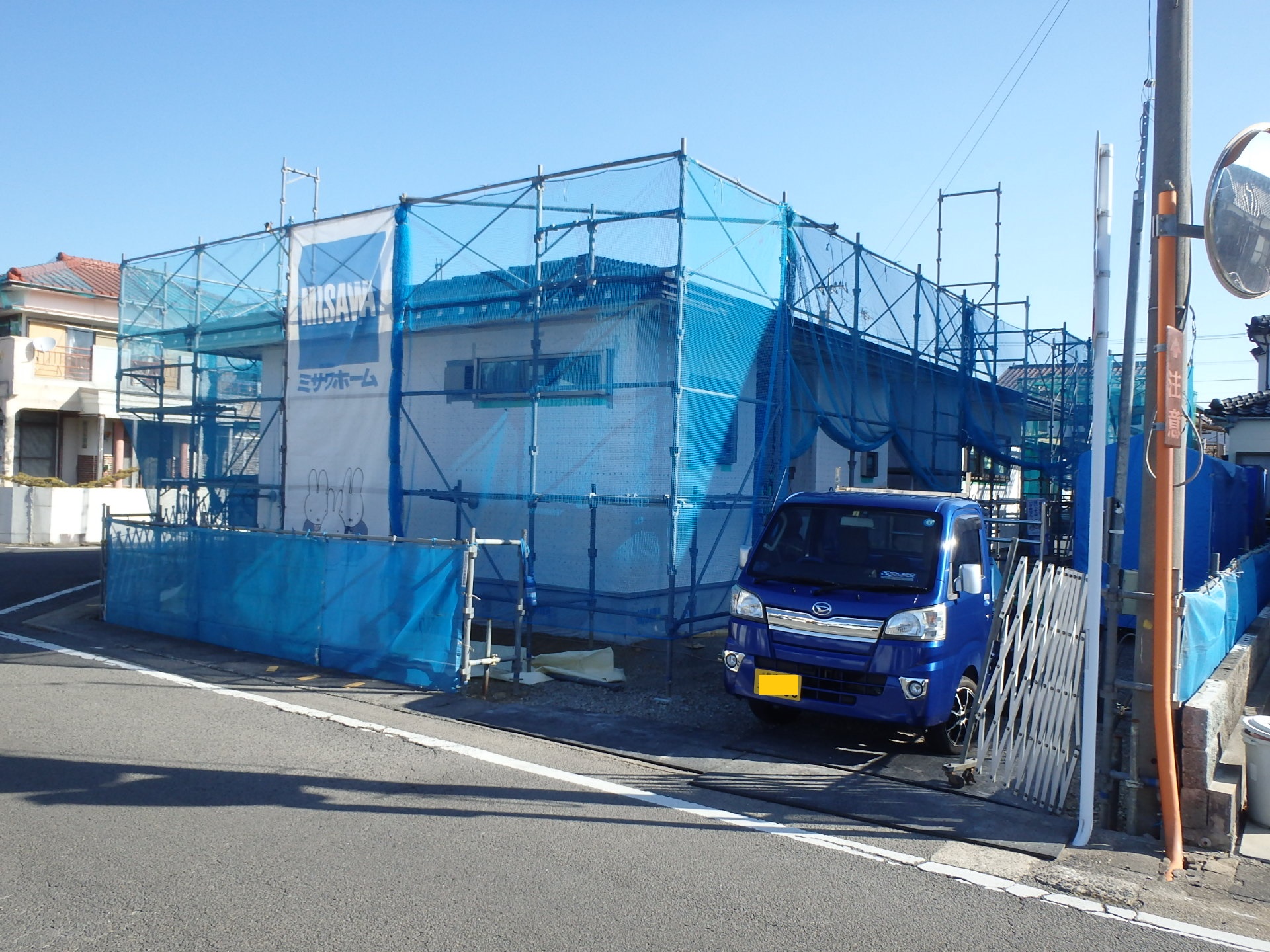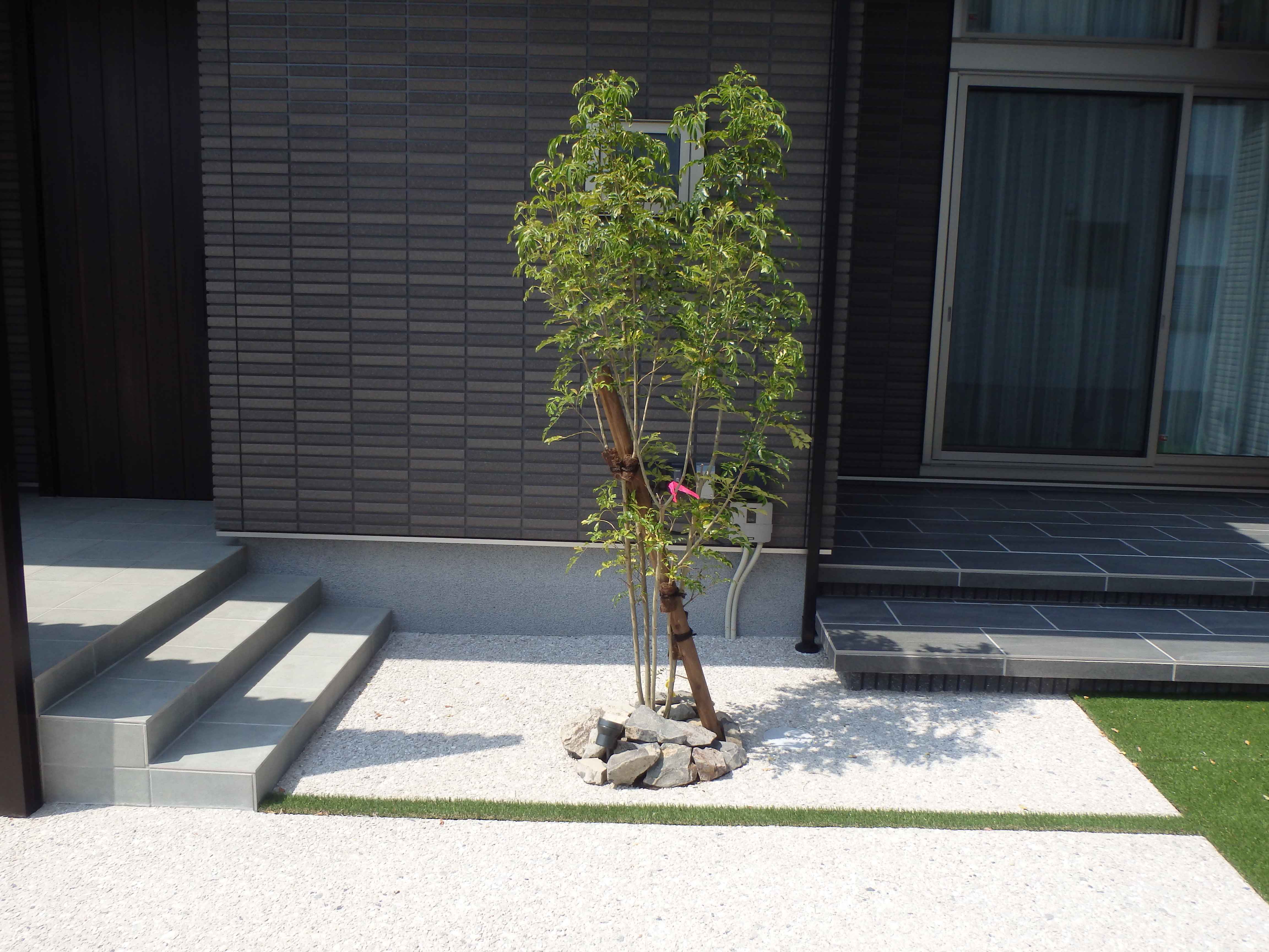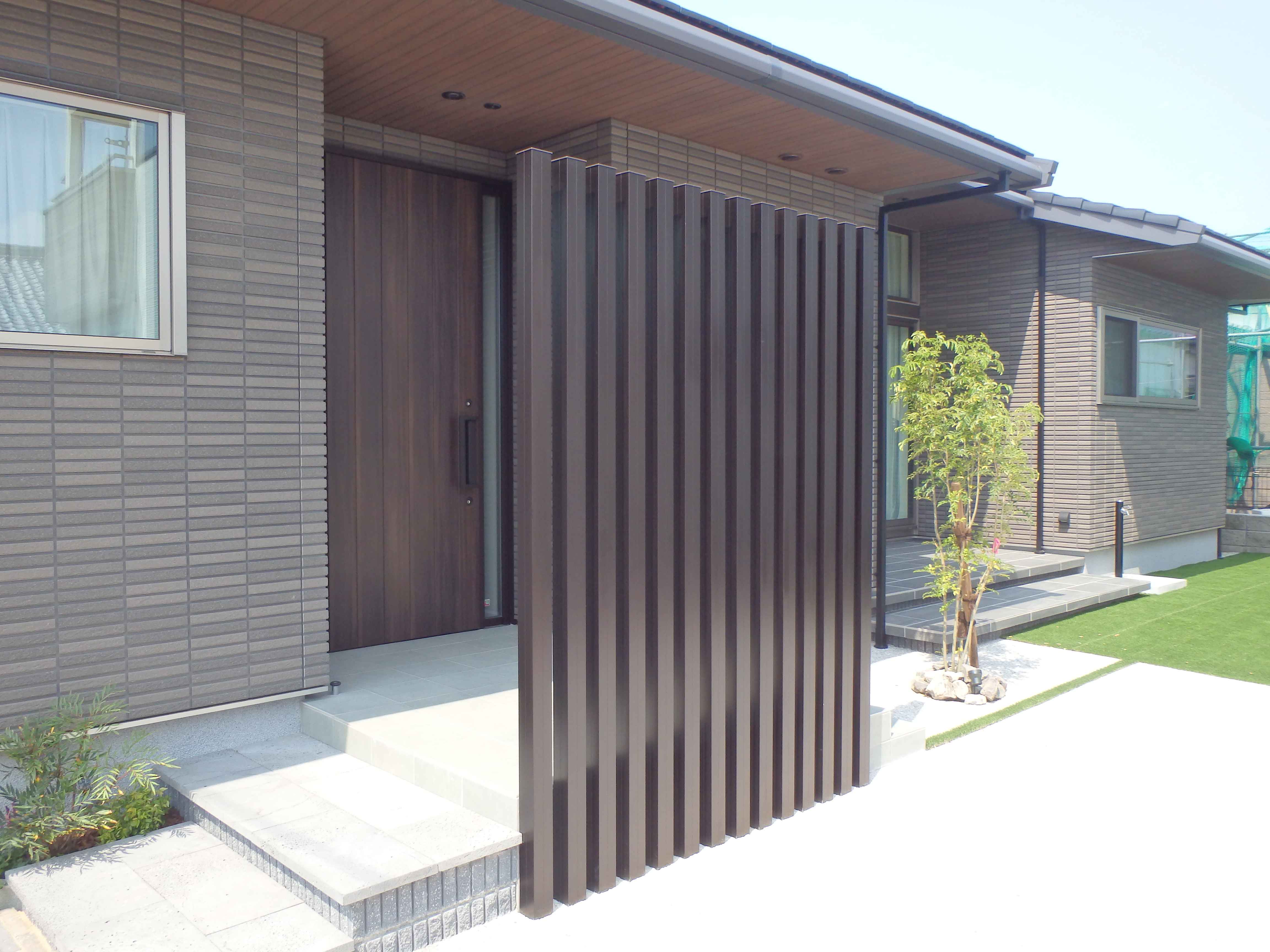 173 駐車場から奥の人工芝が綺麗です、玄関の目隠しもおしゃれです。