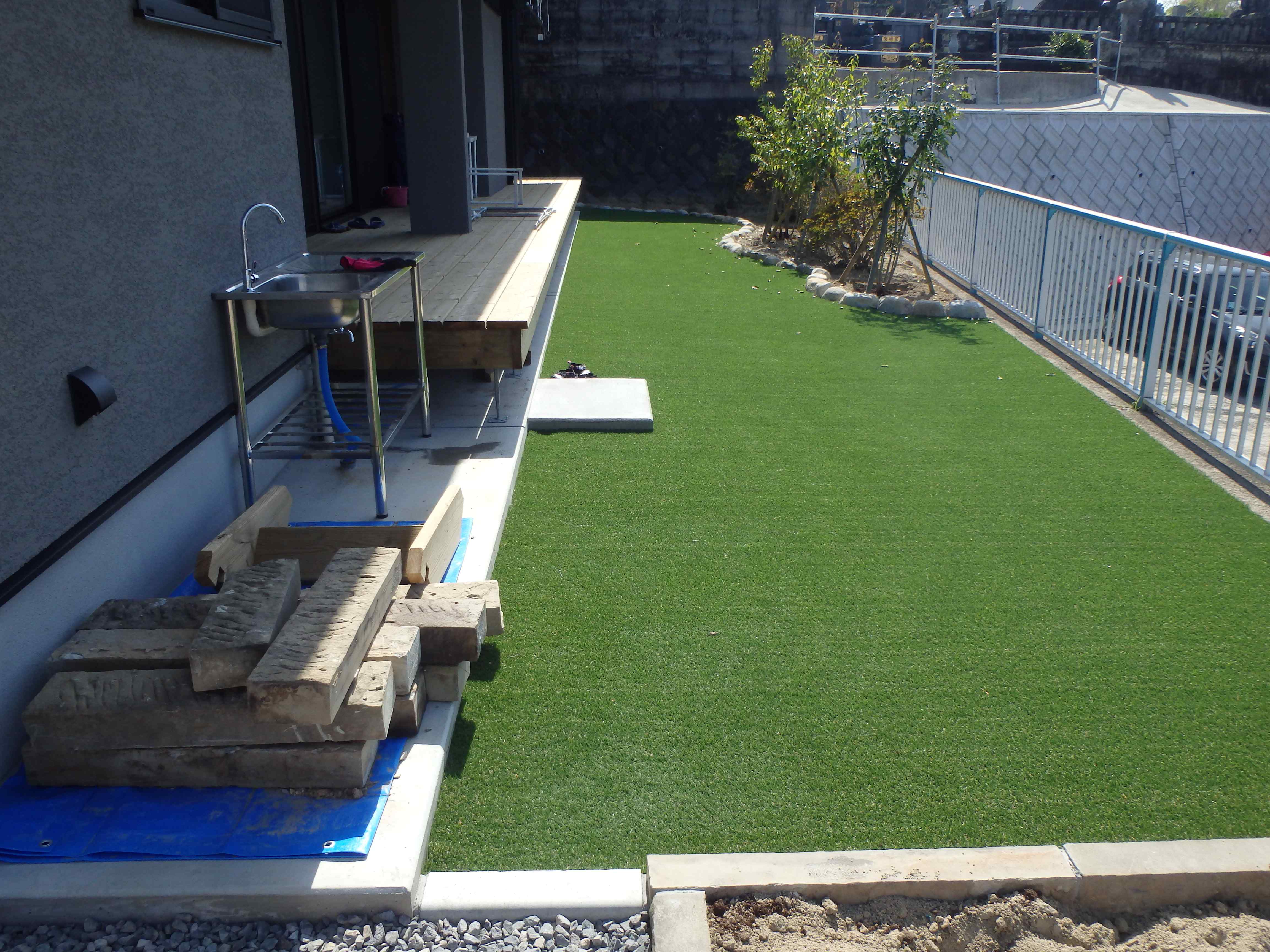 新築外構の施工例: 183 広い駐車スペースとお庭の人工芝、玄関へのアプローチもとても綺麗でおしゃれです。
