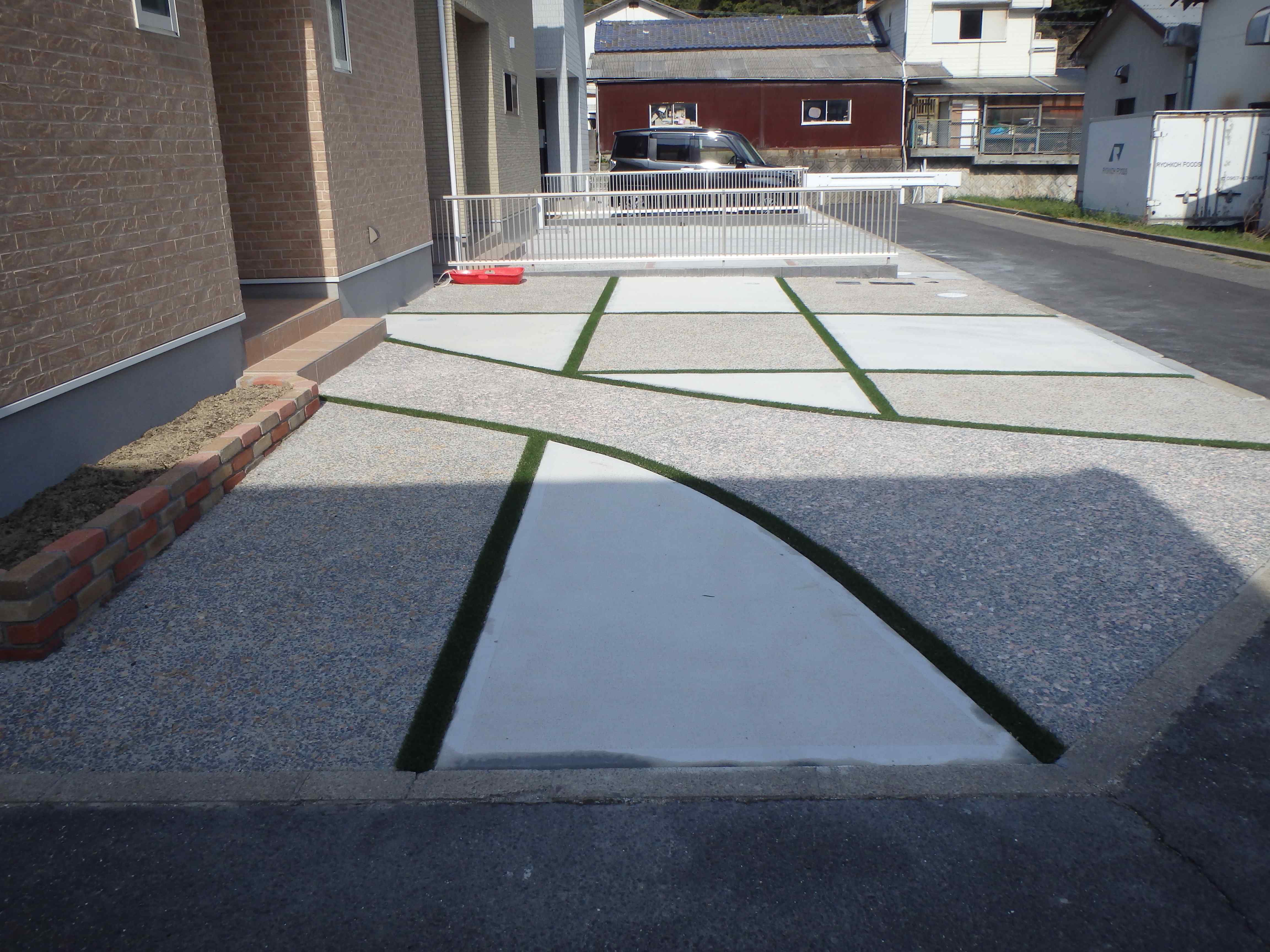 新築外構の施工例: 185 駐車スペースのデザインがとてもおしゃれです、目地には人工芝なのでいつまでも綺麗です。