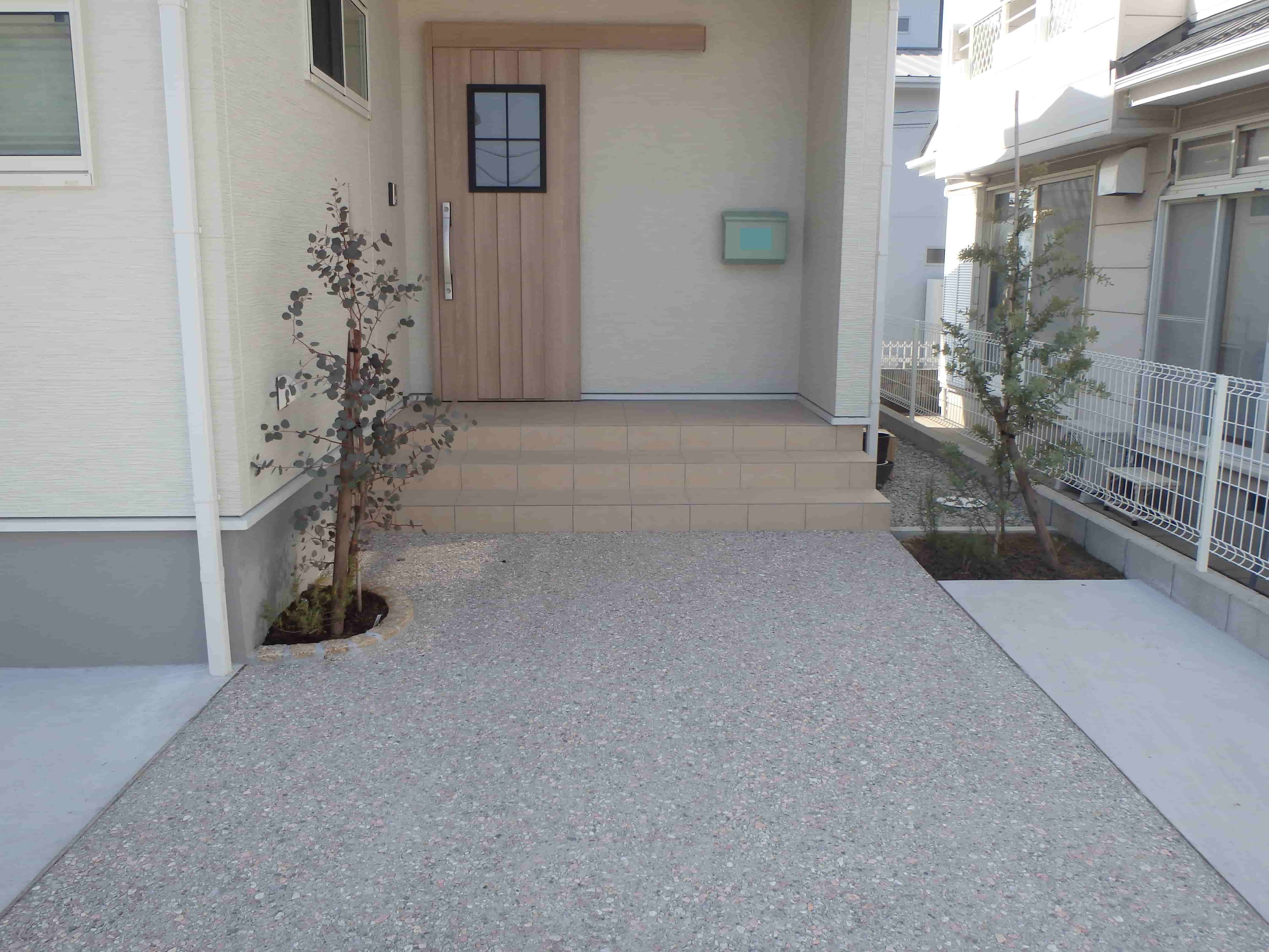 新築外構の施工例: 280 人工芝と花壇の組み合わせいいですね、ワンポイントで緑を入れるのもオシャレです。